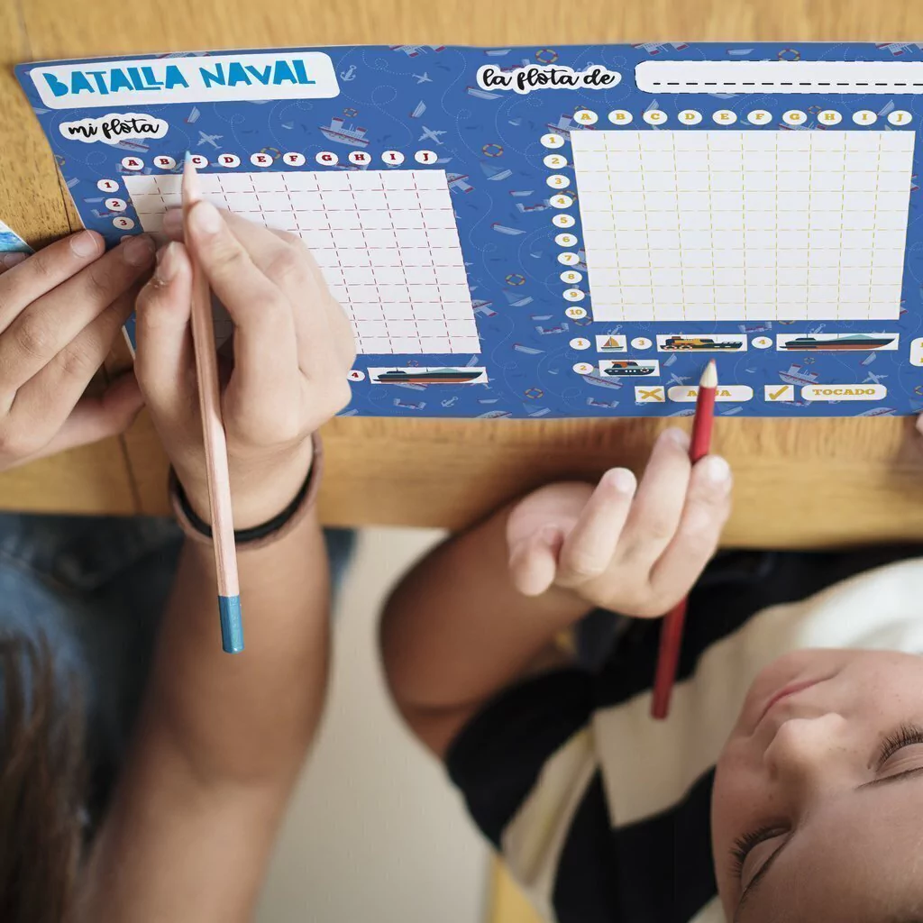 Esta configurado en A4, cuenta de 2 tableros de 10 casilleros en vertical y 10 en horizontal. El dueño del tablero, acomoda sus barcos en el de la izquierda y lo que va preguntando de su oponente, se anota en el tablero de la derecha.