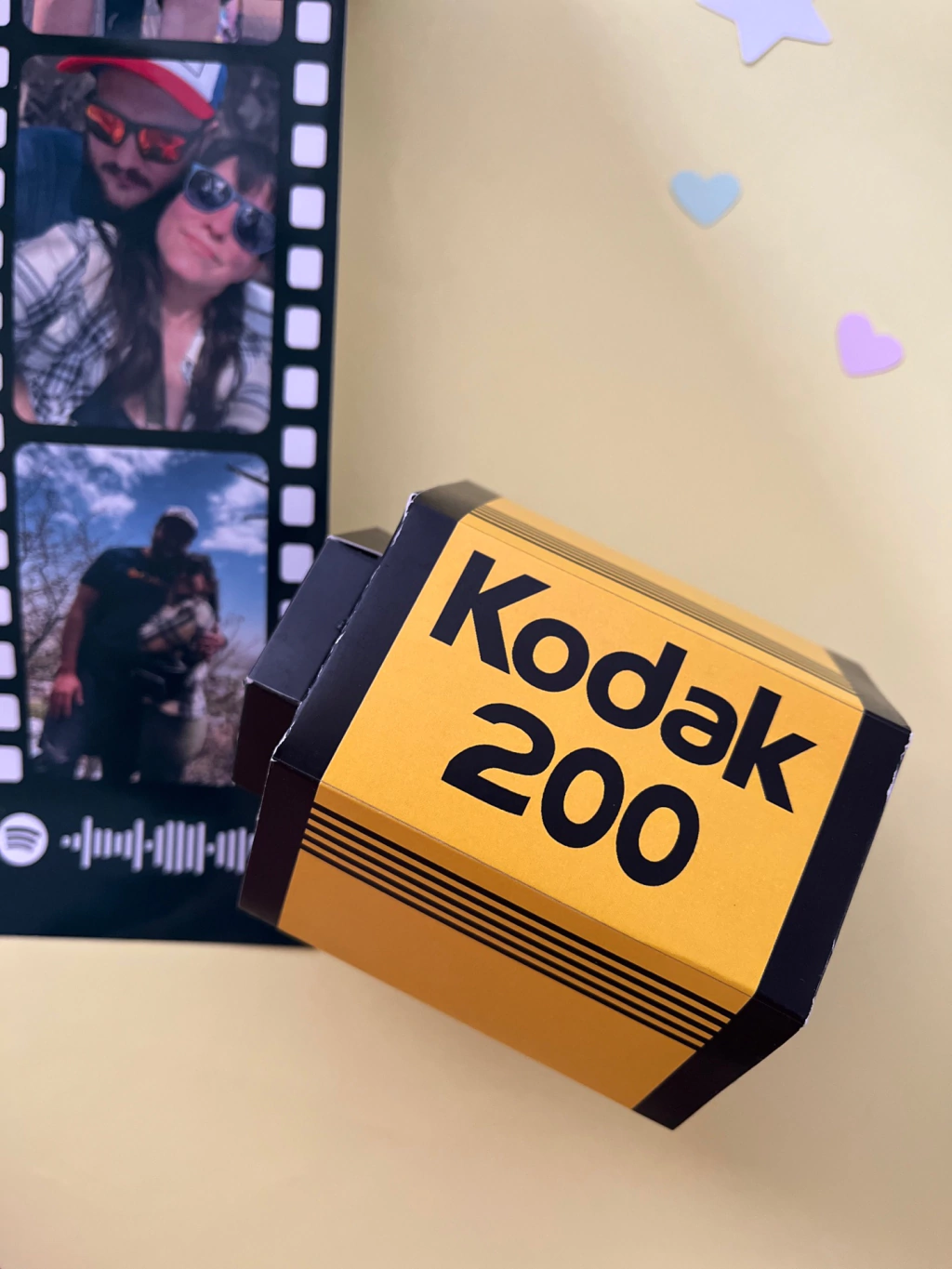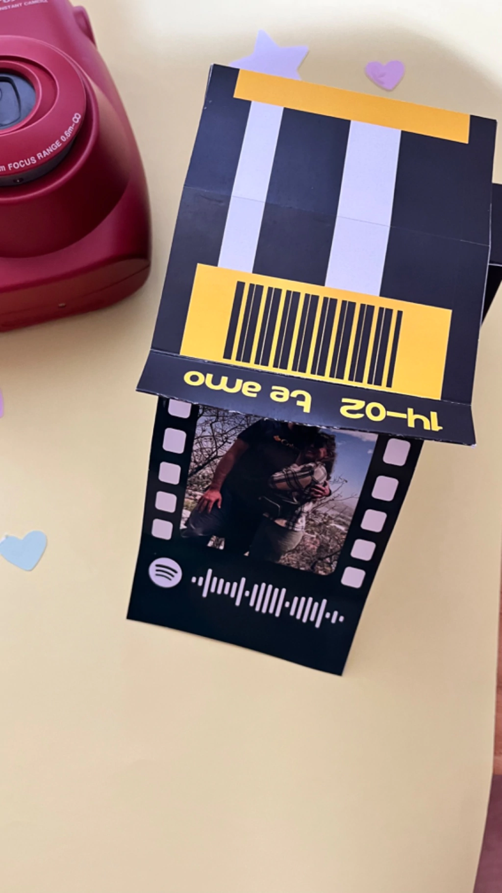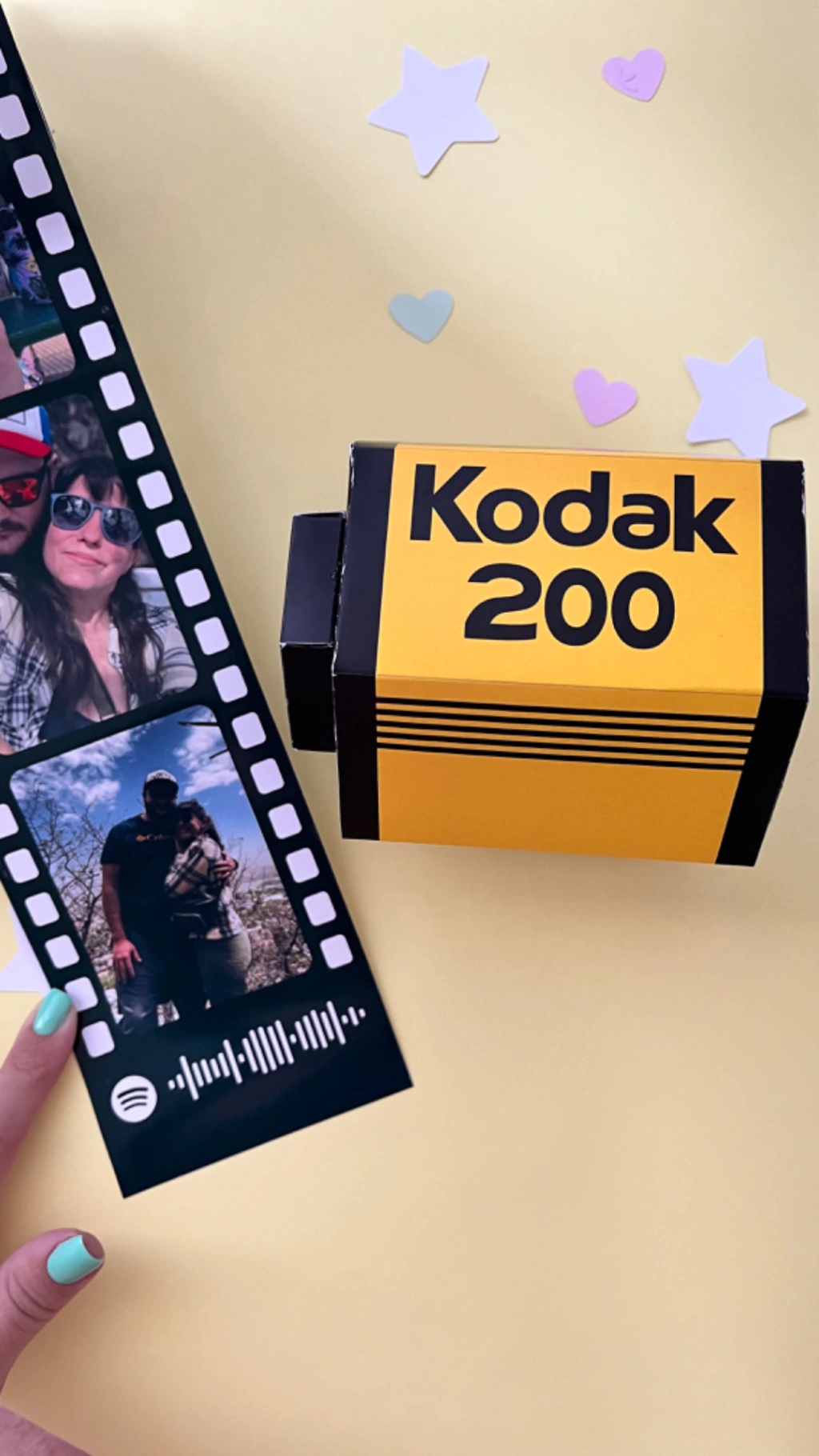 tira de 6 fotos de 8 cm de ancho. Además dentro de la caja le podés colocar lo que quieras. Con canción de spotify