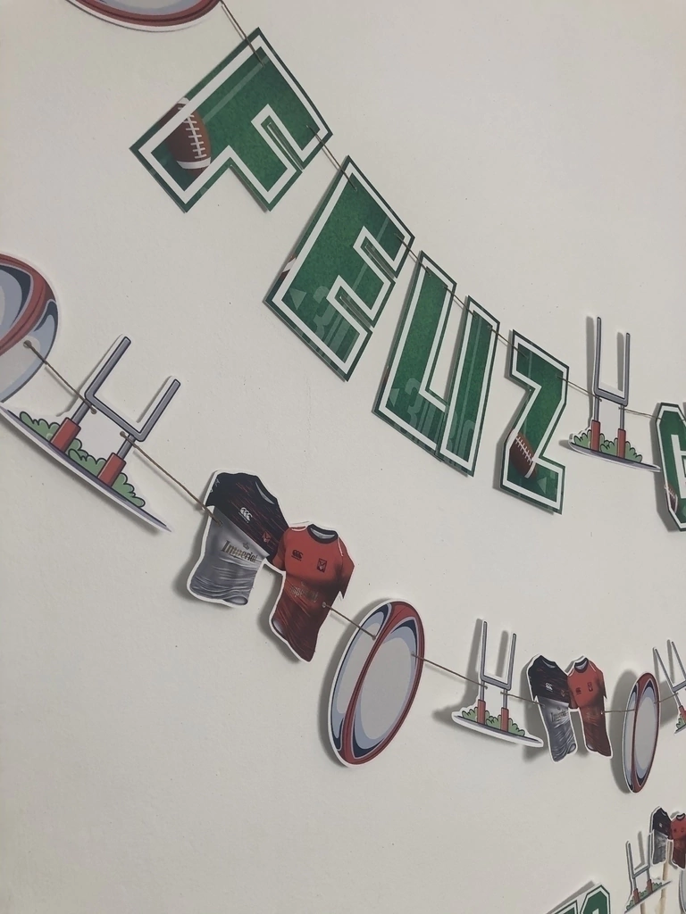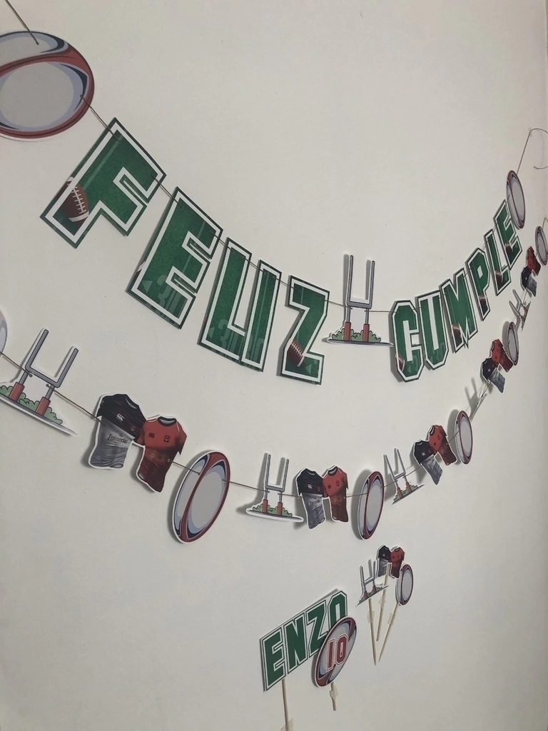 Compuestas por: Feliz Cumple en letras de 14 cm de alto aprox con decoraciones temáticas y una guirnalda temática con figuras de 12 cm de alto aprox impresas.