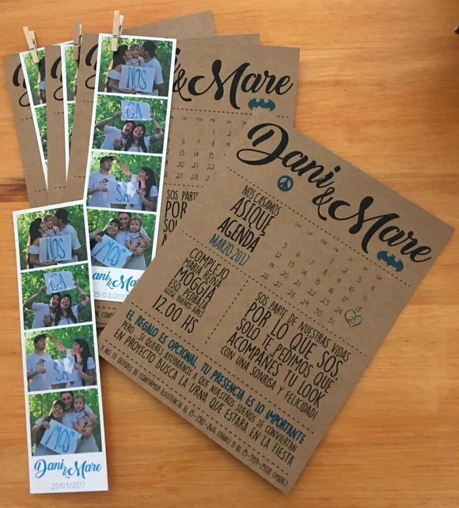 Tiene un tamaño de 15 X 20 cm el tarjeton y 5 x 15 cm la tira de fotos tipo polaroid. Hechas en papel ilustracion de 300 gr la tira de fotos y papel kraft el tarjeton