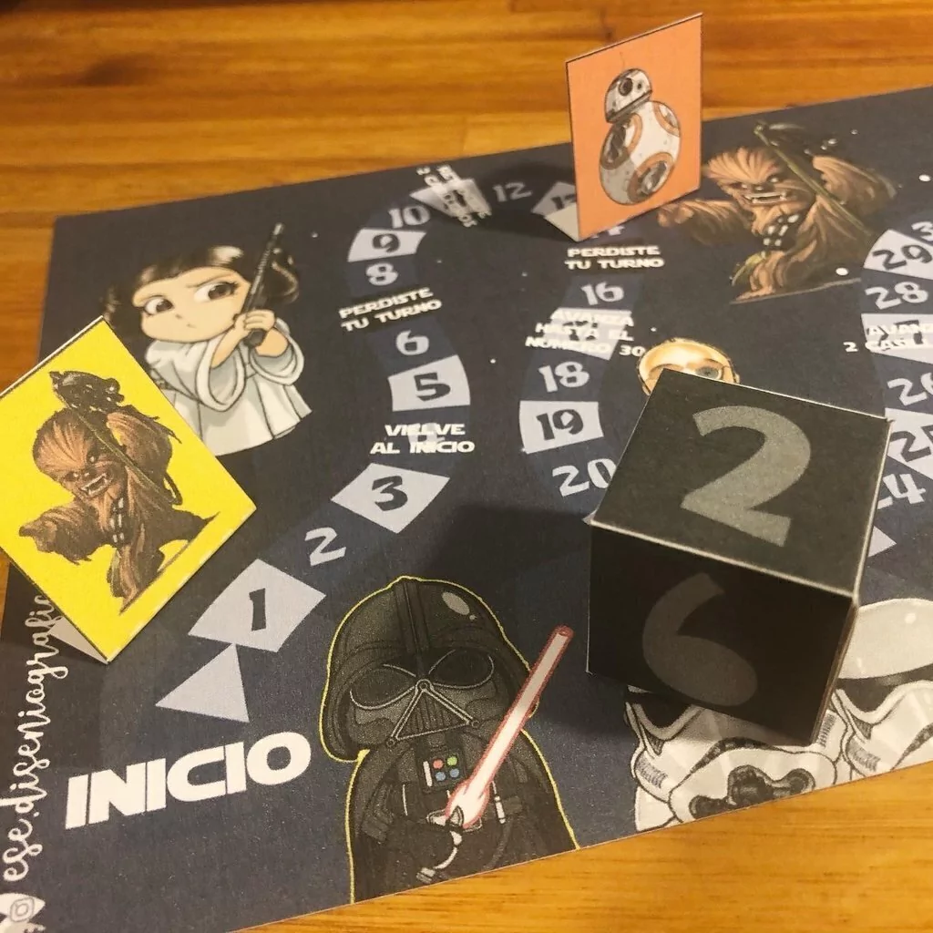 Consta de un tablero de 30X40 cm, impreso en papel ilustración de 3000 gr. Con el dado y fichas para recortar y armar, e instrucciones.