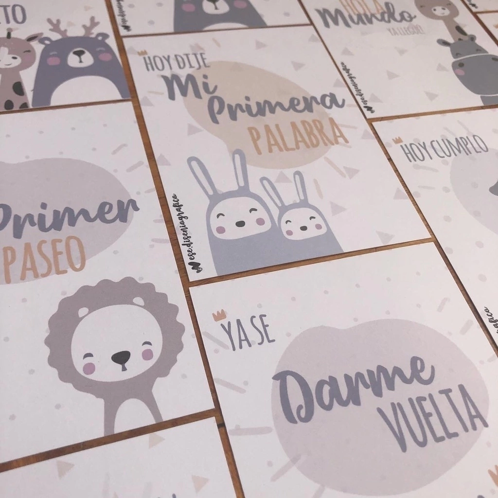 Consta de 16 tarjetones de 10x15 cm. (1 portada, 3 Hoy Cumplo semanas,12 hoy cumplo meses y 12 acciones: mi primer comida, mi primer sonrisa, ya gateo, etc) impresos en cartulina de 250 gr